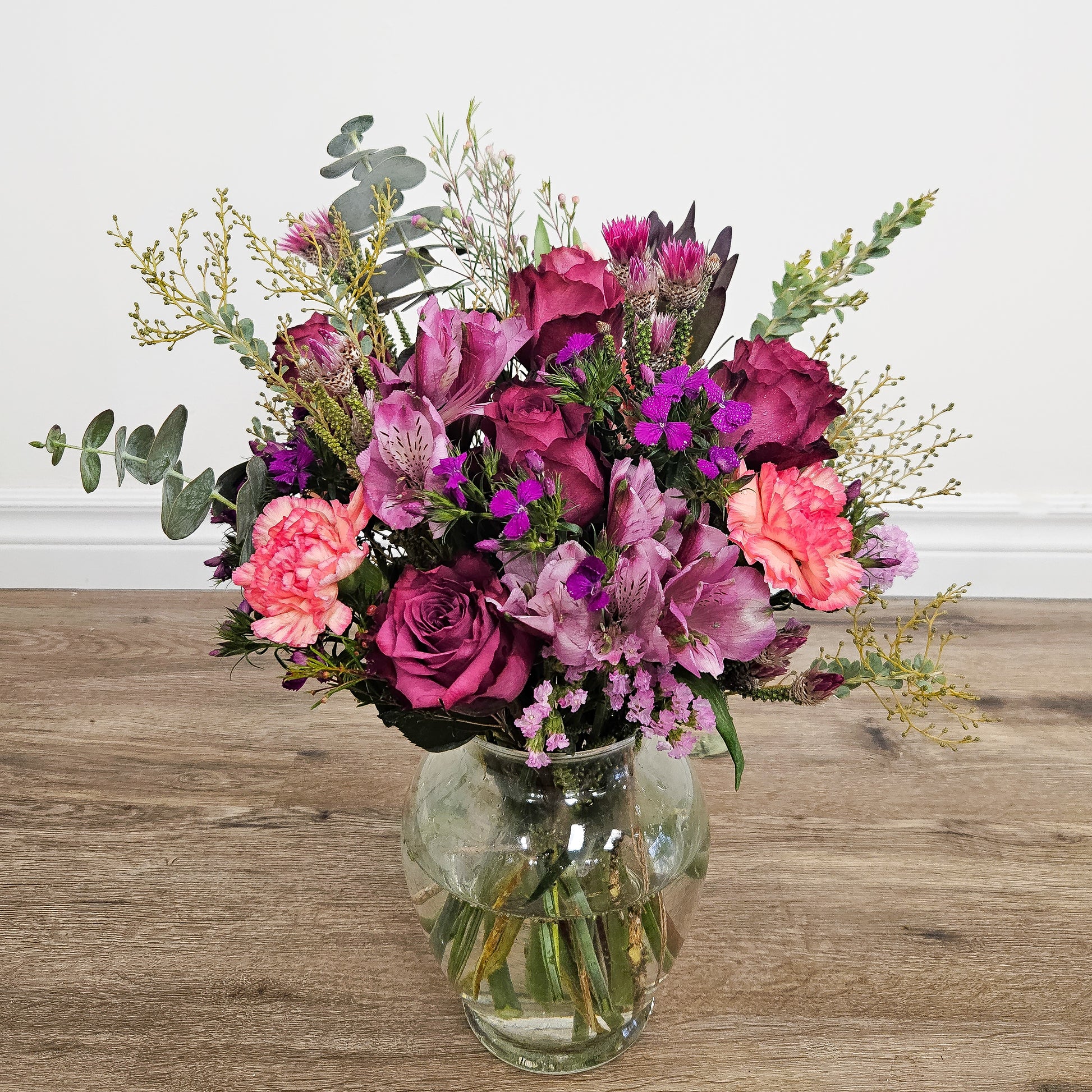 Want something more unique than a classic dozen roses? We will create a stunning, modern design using a range of premium flowers and roses in in tones of red, dark pinks, white and blush to create an unforgettable arrangement that really impresses.